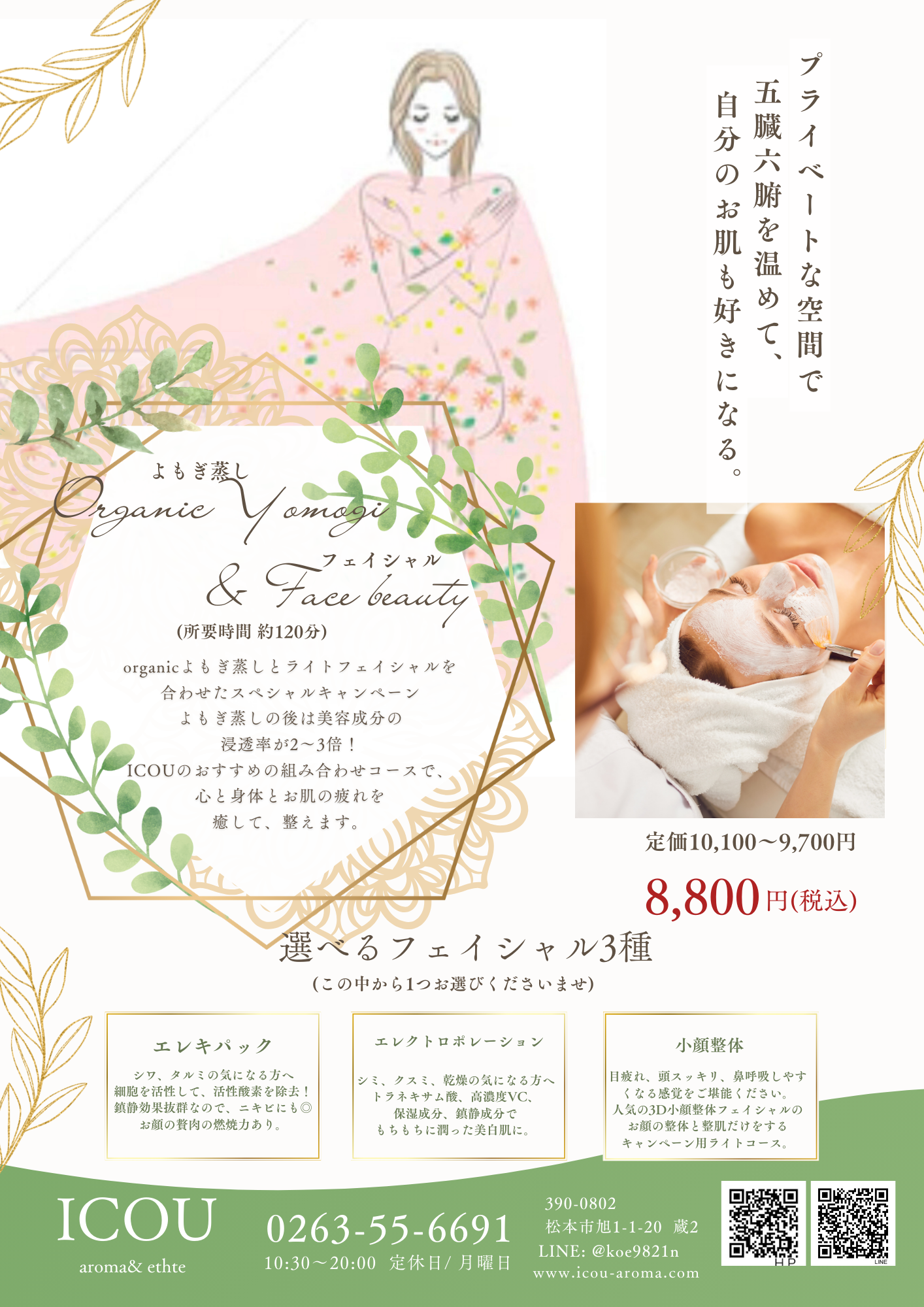 ICOUは2ベットの小さなサロンです。トリートメントルームは完全個室。 店内は蔵と庭園の土、木、花、水のエネルギーが溢れています。 瞑想するような、心が解放されるような、空間で信州産・オーガニックアロマの香りと結果の出る本格エステをご堪能くださいませ。